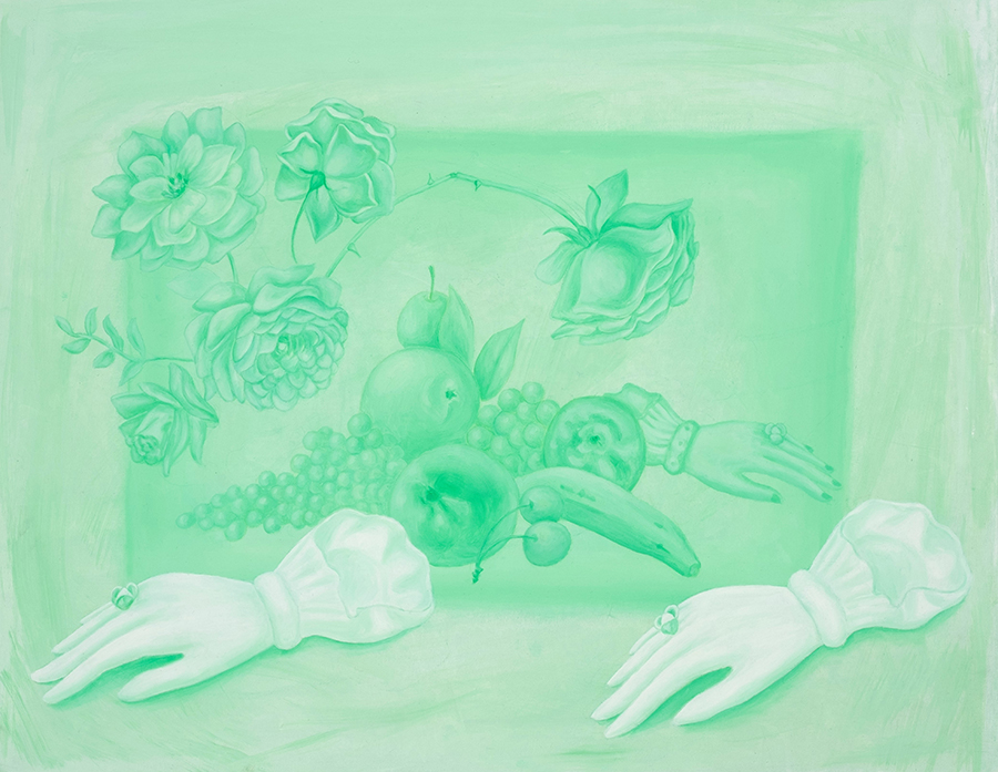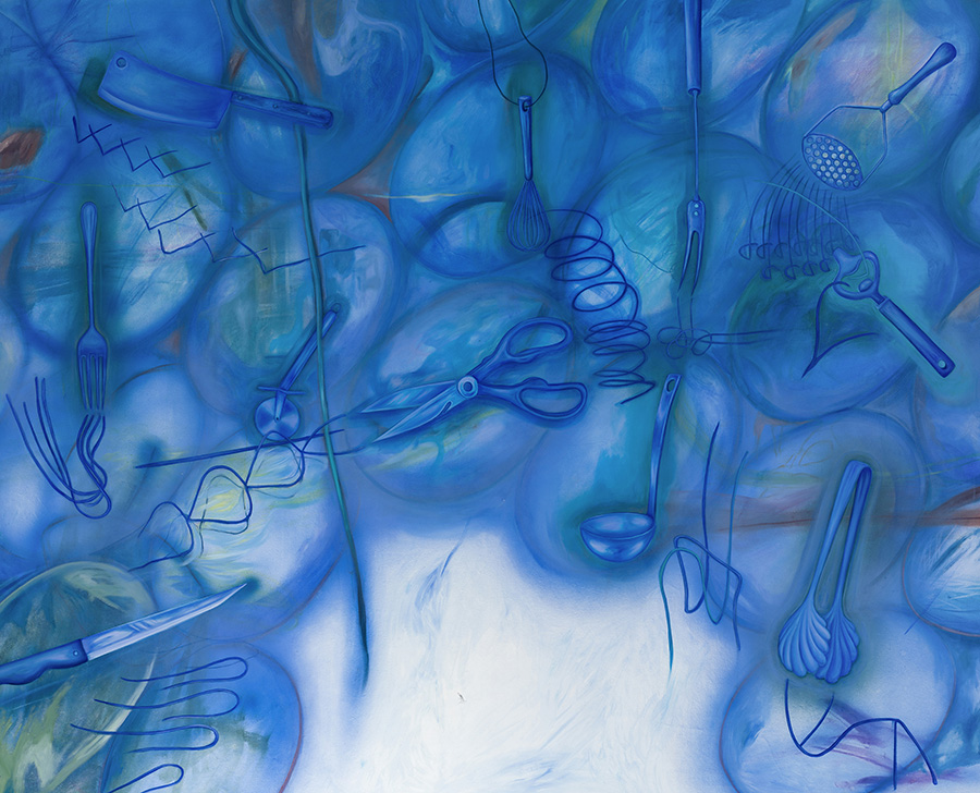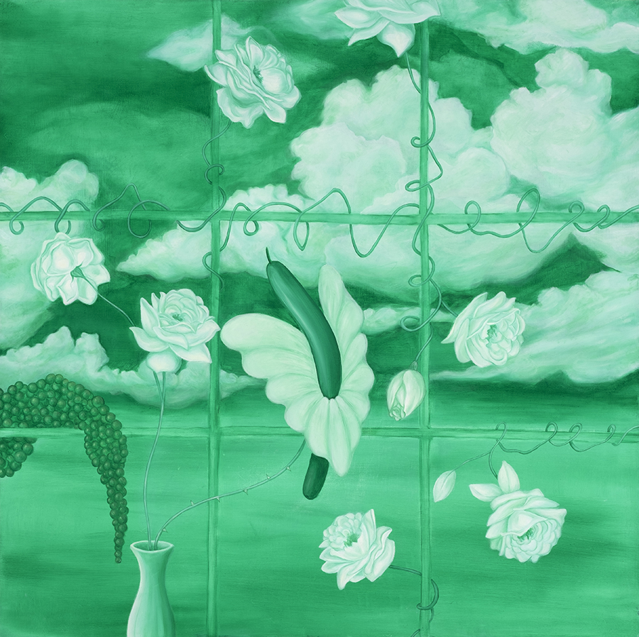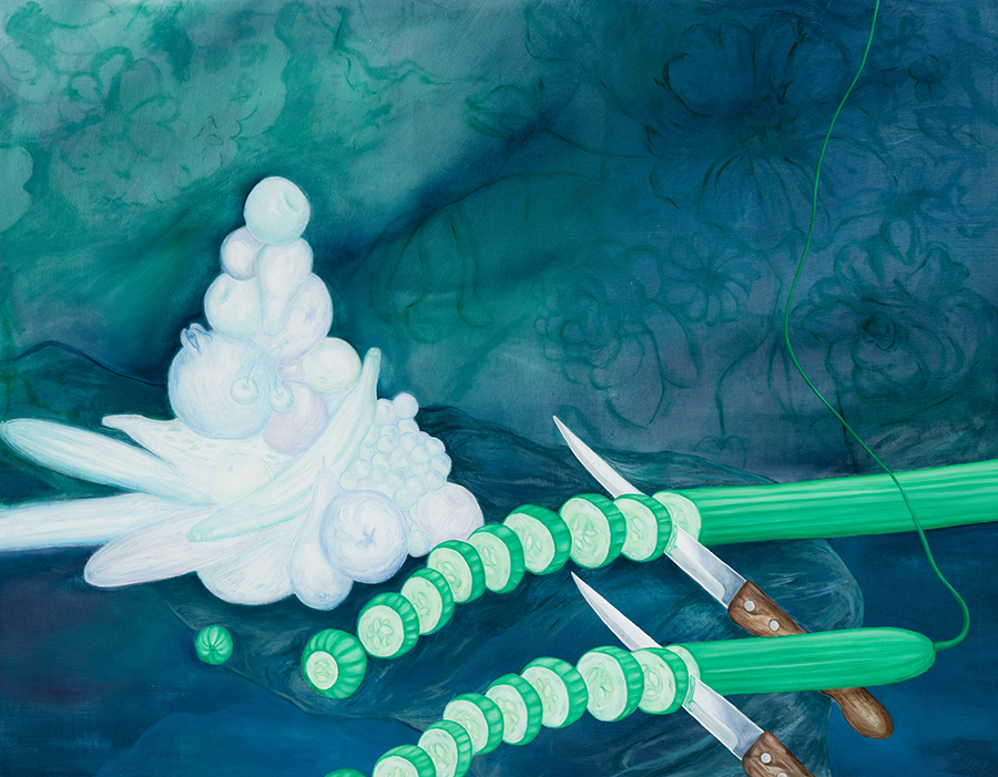 Objects, particularly everyday items like flowers or cucumbers among other things, often recur in her paintings; not only as aesthetic motifs, but as agents of embodied experience. These repeated forms sometimes take on a decorative quality, but this ornamentation is never superficial: it functions as a coded language—sometimes ironic, sometimes critical—always linked to the broader questions of memory, agency, and the intimate politics of visibility. In certain works, the repetition of objects becomes a deliberate strategy to challenge assumed function or meanings, creating entry points for humor or critique.