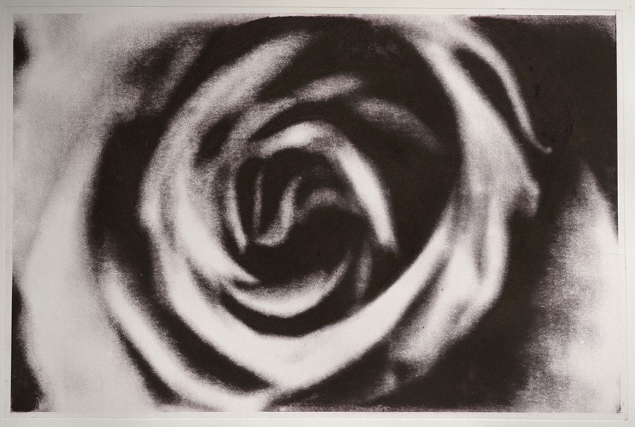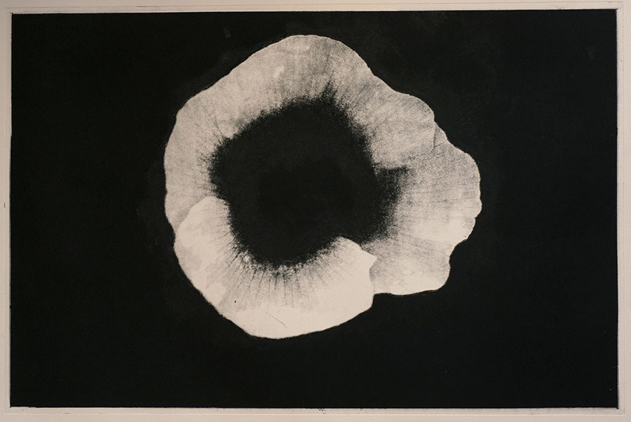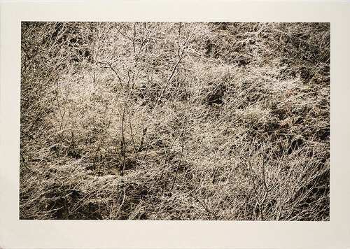 Alongside his recurring broader landscapes, the presence of close-up etching studies also becomes significant. Esfandiari considers these delicate black-and-white or monochrome details as “symbolic cores that hold an entire landscape.” Followed by a year of printmaking, in the second phase of the project, he has used etching to transfer these impressions onto printing plates. The medium’s compact capacity to distill forms into simple abstractions made it a fitting vehicle for translating his observations into visual expressions.