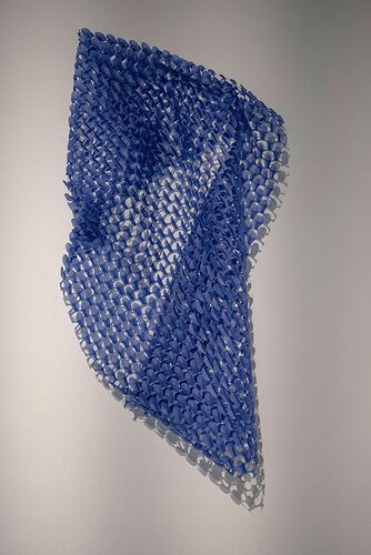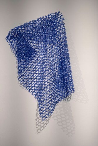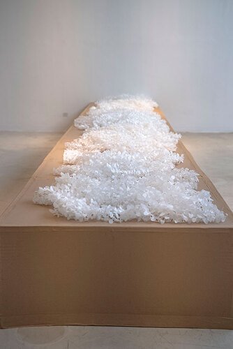 "Tan/Yaad" by Sogol Ahadi has taken shape solely through adopting a single decision and its uninterrupted continuation to the greatest extent possible; the daily performance of a few trivial and repetitive acts with paper that ultimately, through months of the artist’s sustained concentration, become intertwined in a dynamic figure and structure and acquire meaning. This prolonged manual experience brings the delicate and light surface of paper to a quality where the skin comes alive, the layers breathe alongside and against one another, and playfully shimmer under shifting light.