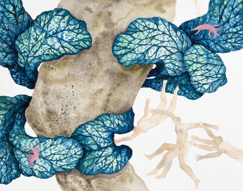 Fueled by lighthearted naive sensibility and sarcasm, Maryam Mohry’s works on paper have a certain narrative quality, indicative of her passion to fully immerse in the process of creation and experimentation. Taking advantage of the translucent quality of watercolor and staying away from applying thick layers of paint, she finds watercolor and gouache best for crafting impulsive and plausible stories. Also a talented sculptor, while addressing environmental concerns, she keeps a sense of playfulness in both her drawings and soft sculptures. By offering notes of cartoonish eeriness in the humanlike expressions of her characters, she keeps the “game” of storytelling connected within all her works. Maryam Mohry currently lives and works in Tehran and has been the subject of several national solo and group exhibits.