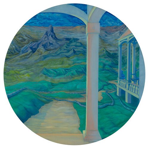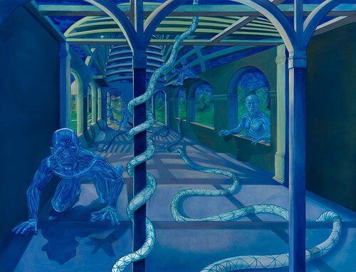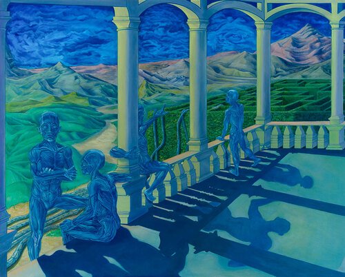 نقاشیها بنایی تخریبشده و بنایی با معماری متفاوت را کنار هم و در جغرافیای دشتمانند و کوهستانی نشان میدهند. اما آنچه بیش از این ترکیب معماری و جغرافیا توجه را جلب میکند، حضور فیگورهایی است با آناتومی انسانی، اما با رنگ و بافتی نامعمول برای گونهی انسان. در کنار این همنشینی، عنصر دیگری در اغلب آثار دیده میشود، چیزی شبیه به شاخه یا رشتهای که از شکلی ناشناس رشد کرده و منتشر شده، و بر وجود ارتباطی فکرشده بین آثار تاکید میکند.