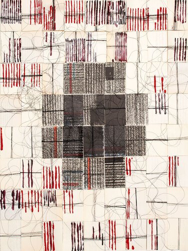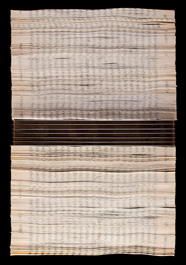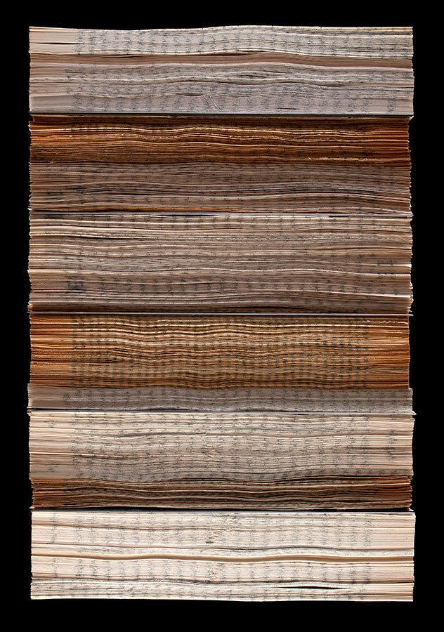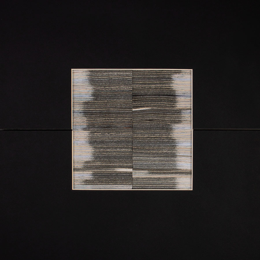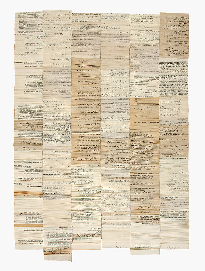 کار بر روی این مجموعه از سال ۱۴۰۲ آغاز شده است. آثار در امتداد کاوش مستمر دانشور در تمرین با کاغذ طی دههی گذشته شکل گرفتهاند. «استکاتو» گفتوگویی پارهپاره میان تیغ و کاغذ است؛ از صفحههای کتاب و روزنامه تا کاغذهای دستساز. دانشور به همنشینی ناپایدار تیغ و کاغذ مینگرد. در این جستوجو، امکاناتی فراتر از کارکرد ابزار را برای تیغ میجوید. او تیغ را از نقش معمولش عبور میدهد و به بخشی از مادهی سازندهی اثر بدل میکند. دانشور در این تعامل فیزیکی عمیق و متمرکز، کاغذ را از جایگاه همیشگیاش فراتر میبرد و آن را به بستری چندلایه برای تامل و معنا تبدیل میکند.