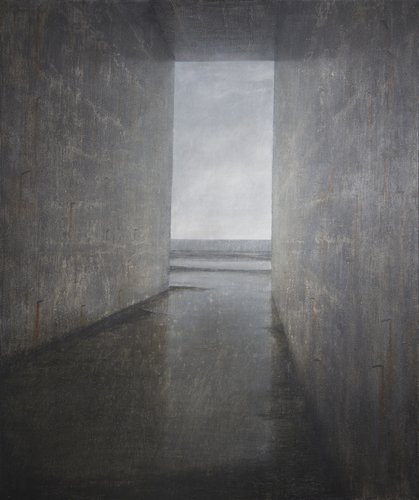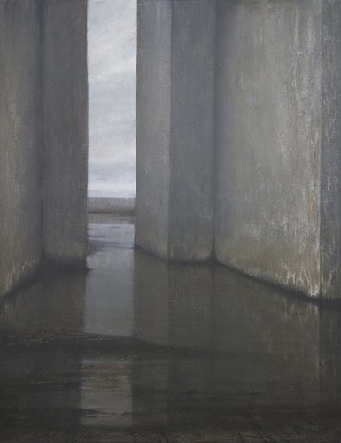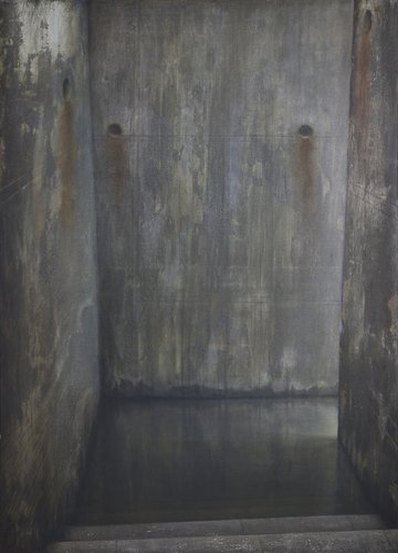این اولین باری نیست که محمد خلیلی سمتی خاموش را نقش میزند، او پیشتر هم پارههایی از این دست را در افق خویش نشانده بود. این بار ــ و بیش وکم همچون گذشته ــ «سمتِ خاموش» مکانی تاریک و بینور نیست، سمتِ خاموش وضعی ادراکی است، وضعی که در آن اشتیاق و هراس وزنی برابر مییابند. شیوهی بازنمایی، و همجواری معنادار عناصری همچون آسمانِ ابرآلود، علفزار، سنگ و جدارههای سیمانی ــ که چهبسا بتوان از آنها همچون عناصر ثابت نقاش سخن گفت ــ تصویرهای او را در مرزی میان فضایی مألوف و نامألوف قرار میدهند. این تصویرها گرچه میتوانند «حتی» بازنمایی پارههایی از جهان واقعی ما باشند اما بهسان درنگی در زمان و مکان به حساب میآیند و تجربهی انقطاعی شناختی، یا چهبسا پرتاب شدن به سطحی دیگر از آگاهی را میسّر میکنند. تلاقیگاه زمختی دیوارههای سیمانی و لطافت آب: این است آنچه نقاش در آخرین پردههایش به دیدار آن میرود، تلاقیگاه سایهها و لمعات کمفروغ نور بر آب، آبی که گاه به آبی دیگر راه مییابد، به آبی گشودهتر، گاه محصور میماند، آنسان که گویی تا ابد خاموش و بیحرکت است. نقاش در این پردهها از حریم علفزار و سنگ اندکی عقبتر میآید (یا به پیش میرود!) تا این بار هندسهی روح خود را با فضایی محصور اندازه کند. این اتاقکهای آبگرفته بدیل همان مکانهای غریب و همیشگی نقاش است، اتاقکهایی گشوده که او به دیدارشان میرود تا پرسهی روح خود را در هوای تودرتوی آن نظاره کند، یا چهبسا ذهن خویش را با مادهی آن در هم آمیزد. از این منظر، بیراه نیست اگر کنش نقاشی را نزد خلیلی عملی کیمیاگرانه بدانیم.