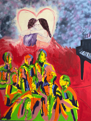 ما در چه دنیایی زندگی میکنیم؟ چه چیزی واقعیتمان، ترسها و نگرانیهایمان را تعریف میکند؟ با این حال، چقدر آزادیم؟ بهنظر تعداد نامشخصی از قضات همراهمان هستند تا از اعمالمان پرسش کنند. اما این عاملان نقد و قضاوت چه کسانی هستند؟ آنها بیهویت و درعینحال آگاهند. در هر گوشهای ما را دنبال میکنند و همیشه حاضر هستند. زمینههای رنگی درهمتنیده و تکرارشوندهی زرد، نارنجی، آبی و سبز، تجسم پیکر آنها و ابراز حالات چهرهشان است. این صورت ها تنها یک مشاهدهگر نیستند، گویی ازادی را در تفکر و عمل گرایی تحد تاثیر قرار داده اند. چه ان ها توسط توده ی جامعه ساخته و به ما تحمیل شده و چه زاده ذهنمان باشند، تبدیل به نقادان درونی ما میشوند، که ما ان را به صورت مرتب باز تولید و زنده نگه می داریم.