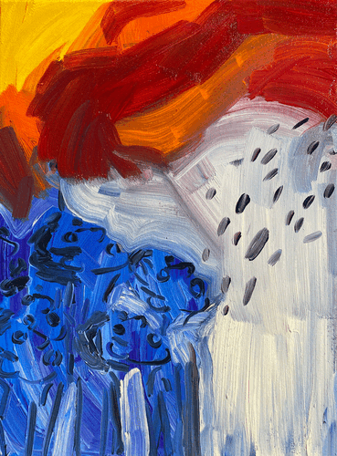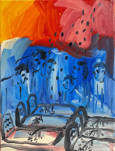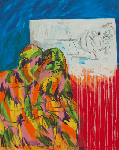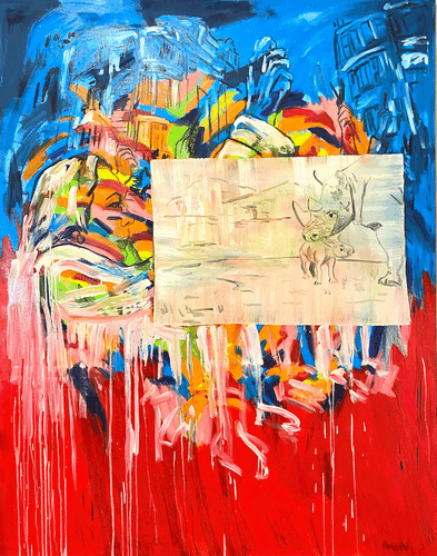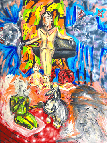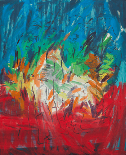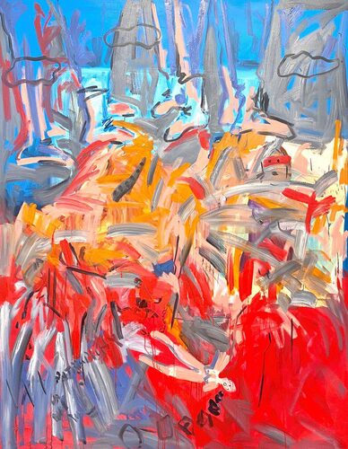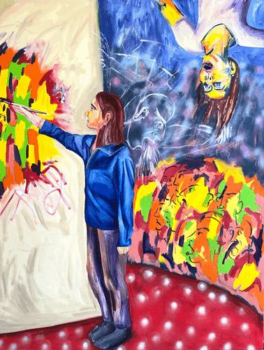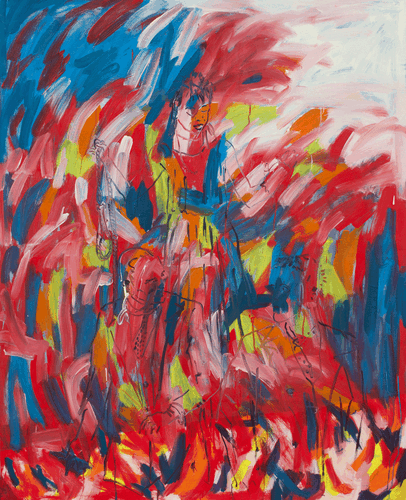 گسترههای رنگی همانند منظرهای رویایی روی بوم آشکار میشوند و گاهی ساختاری تار و مبهم خلق میکنند که یادآور فضاهایی بیپایان است. گویی روی ابری شناور است. این حس بیوزنی با ضربهقلمهای قدرتمند خنثی میشود. گسترههای رنگیِ در حرکت، با درخششی شدید، شامل رنگهای قرمز درخشان، سبز، زرد، نارنجی و آبی در شفافیت کار دخیل میشوند و جلوهای مات را روی بوم مینشانند. تاثیرات فضایی که توسط رنگها ایجاد شده، لایه به لایه پدیدار میشود، تاثیراتی که مابین کدری و شفافیت در ارتعاش است و حدفاصل تعمق و بیقراری در نوسان. درنهایت، پیکرهها از این فضاهای رنگی پدیدار میشوند، برخی با خطوط ساده تصویر شدهاند و برخی دیگر به وضوح و با ویژگیهای مشخص کار شدهاند. گاهی شکلک درمیآورند، گاهی عزادارند و گاهی هم فیگورهایی وحشتزده هستند که نگرش درونیشان از طریق بازی رنگ و خط بهوضوح قابل دریافت است.
