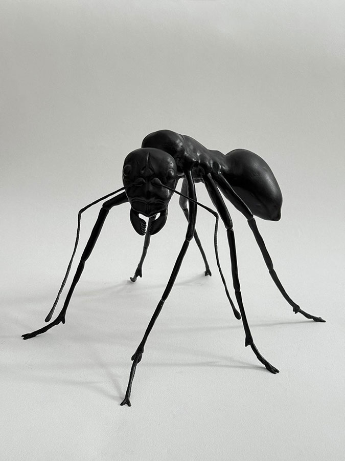 «مورچه همواره بهعنوان موجودی کوچک اما پیچیده، توجه من را به خود جلب کرده است. در سطح میکروسکوپی، فرم و ساختار آن میتواند حتی ترسناک به نظر برسد، اما به دلیل ابعاد بسیار محدود، این جنبه از دید انسان پنهان میماند. آنچه اهمیت بیشتری دارد، رفتارهای فردی و اجتماعی مورچه است؛ رفتارهايی که در فرهنگهای گوناگون به نمادی از کار، تدبیر و همبستگی بدل شدهاند، رفتارهایی که در طول تاریخ در ادبیات و ضربالمثلها بهعنوان الگویی برای پشتکار، کار گروهی، تلاش جمعى و اتحاد مورد استفاده قرار گرفتهاند. ویژگیهای فیزیکی و اجتماعی مورچه، برای من بهعنوان یک مجسمهساز، بستری مفهومی فراهم کرد تا این موجود را در ابعادی فراتر از مقیاس طبیعی آن بازنمایی کنم. انتخاب مورچه در مقیاس بزرگ، نه صرفا یک بازتولید زیستی، بلکه حرکتی است برای برجستهسازی مفاهیمی چون صبر، تلاش و همبستگى. این تغییر مقیاس، مورچه را از جایگاه یک موجود نادیدهگرفتهشده خارج کرده و آن را به یک نشانهی بصری قدرتمند تبدیل میکند؛ نشانهای که بهواسطهی حضور حجمیاش، مخاطب را وادار به بازاندیشی در نسبت میان کوچکی ظاهری» و «عظمت معنایی» میسازد.»
