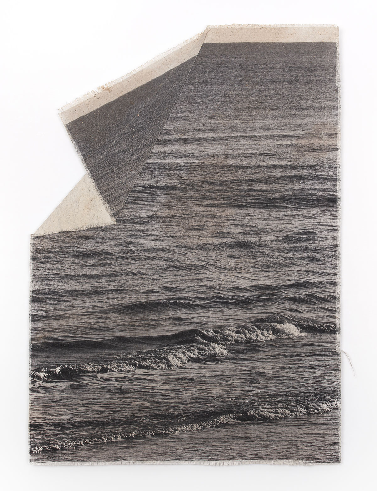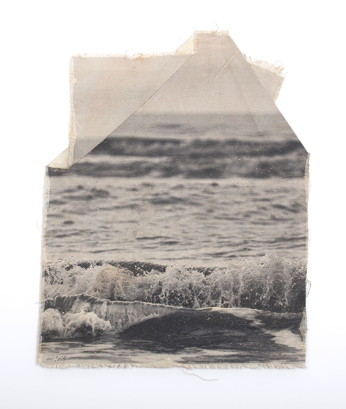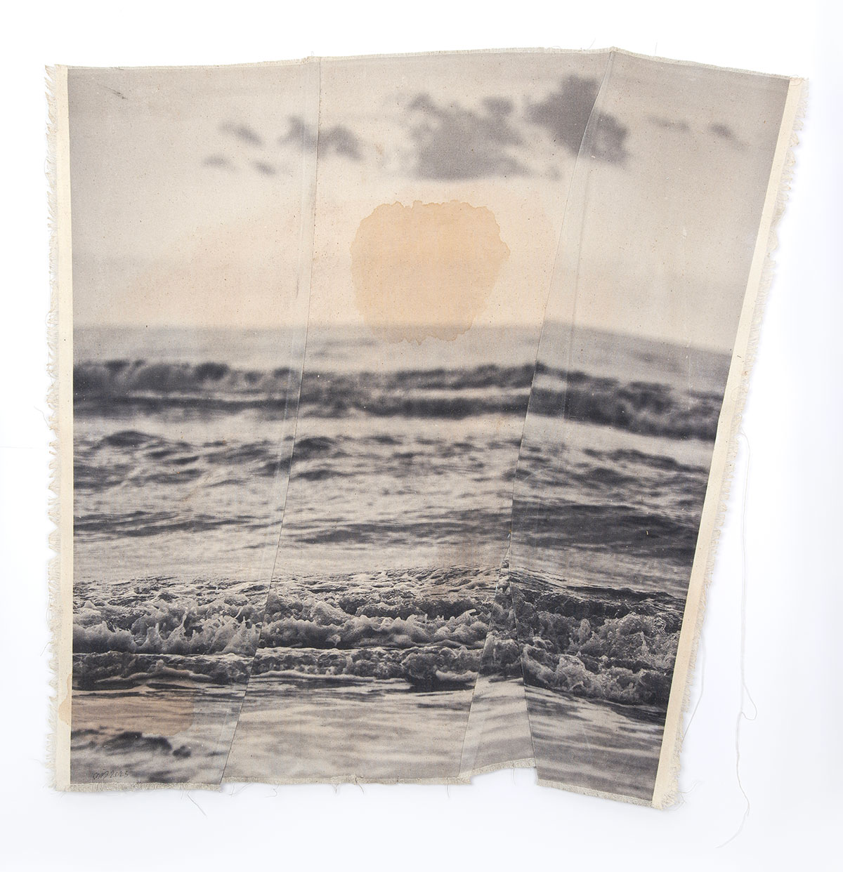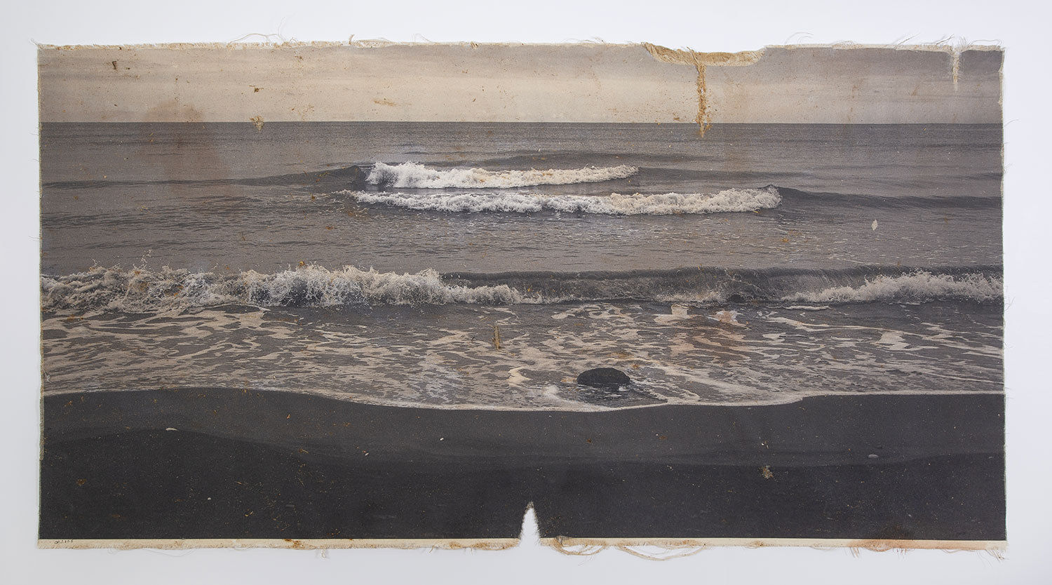 هنرمند عکسهای این مجموعه را در طول سه سال گذشته گرفته و زمان پس از آن را صرف اندیشیدن به این پرسش کرده که چگونه سوژهای با این عظمت میتواند وضعیتِ متناهیِ همهی پدیدهها را بیان کند. مهدیزاده در ادامهی رویکرد دیرینهی خود در دستکاری تصویر عکاسانه، اینبار عکسهایش را بر روی پارچهی متقال چاپ کرده؛ زمینهای که امکان مداخلهی فیزیکی بیشتری را فراهم میکند. او به پارچه با استفاده از سریش و مواد طبیعی مانند بابونه و افتیمون بافت بخشیده، آن را با چای و قهوه رنگ کرده و در نهایت سطحش را پاره کرده است. در نتیجهی این فرایند، تصویرِ بهظاهر بینهایتِ دریا به ابژهای دستکاری و قاببندیشده و درعینحال بیثبات بدل شده است.