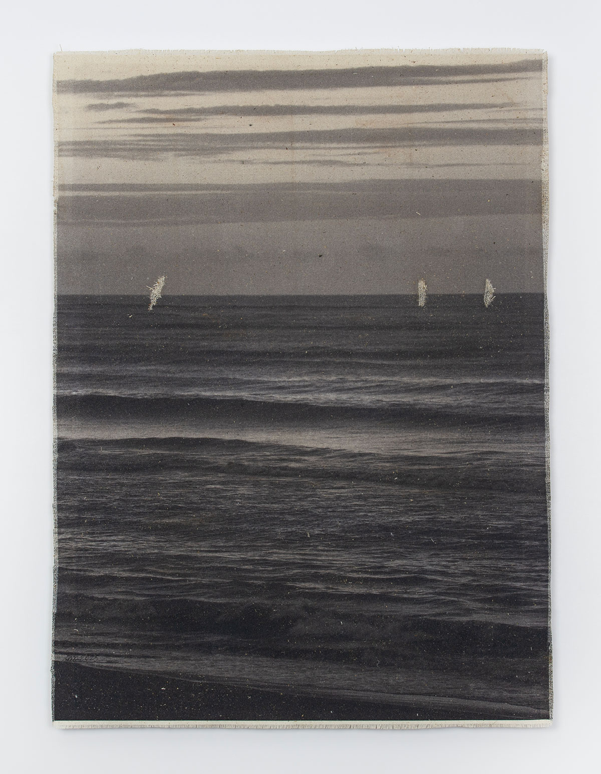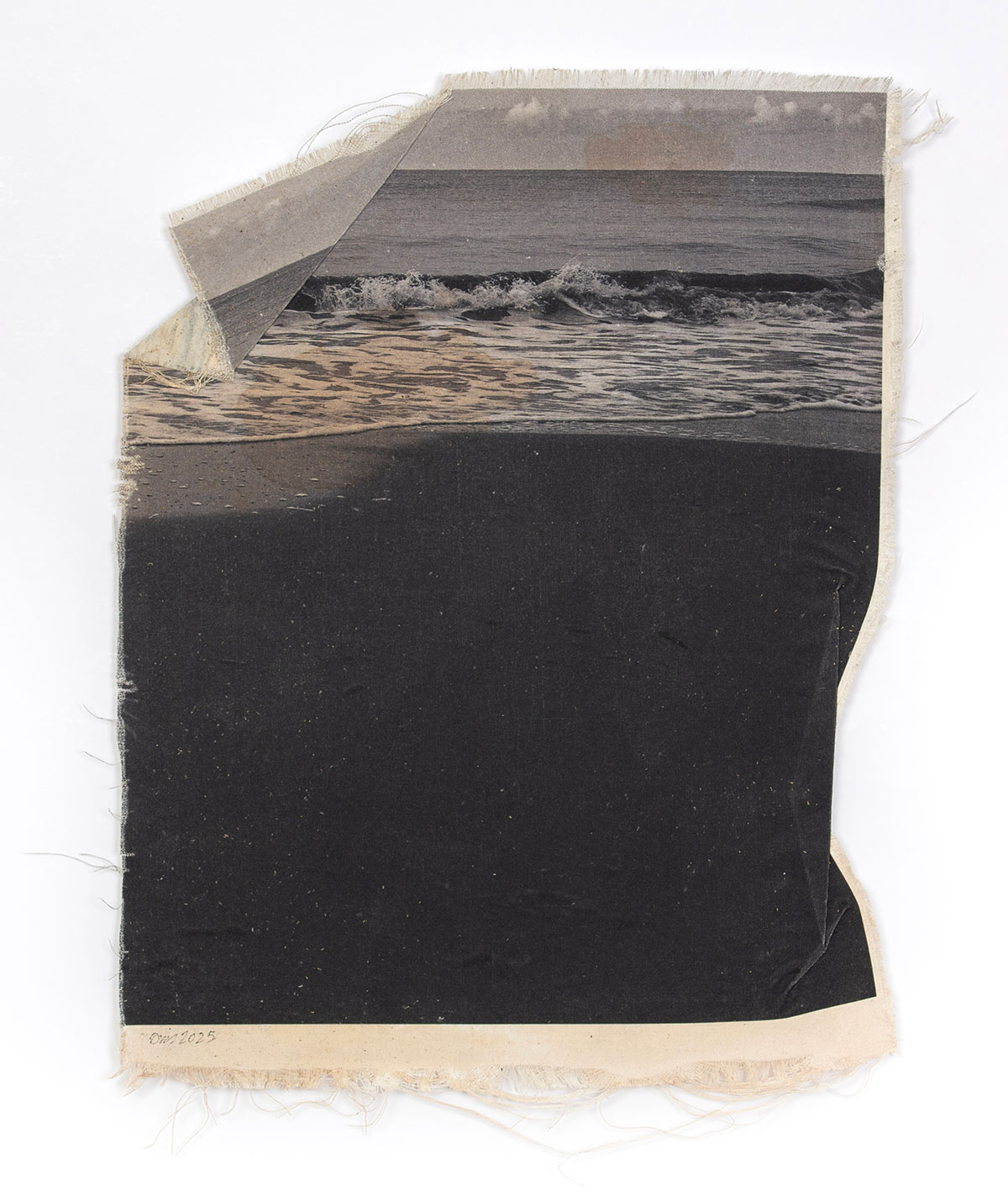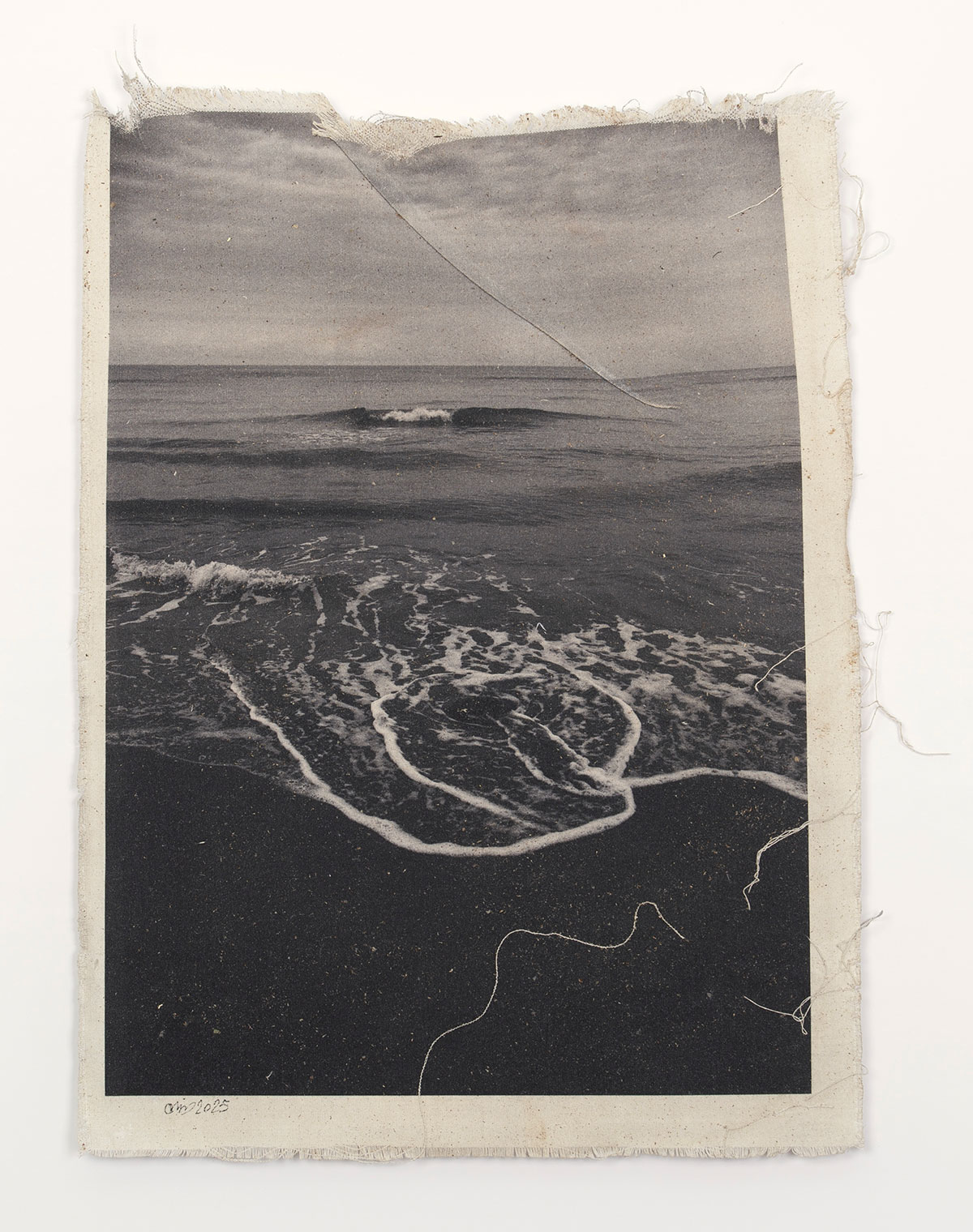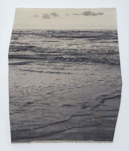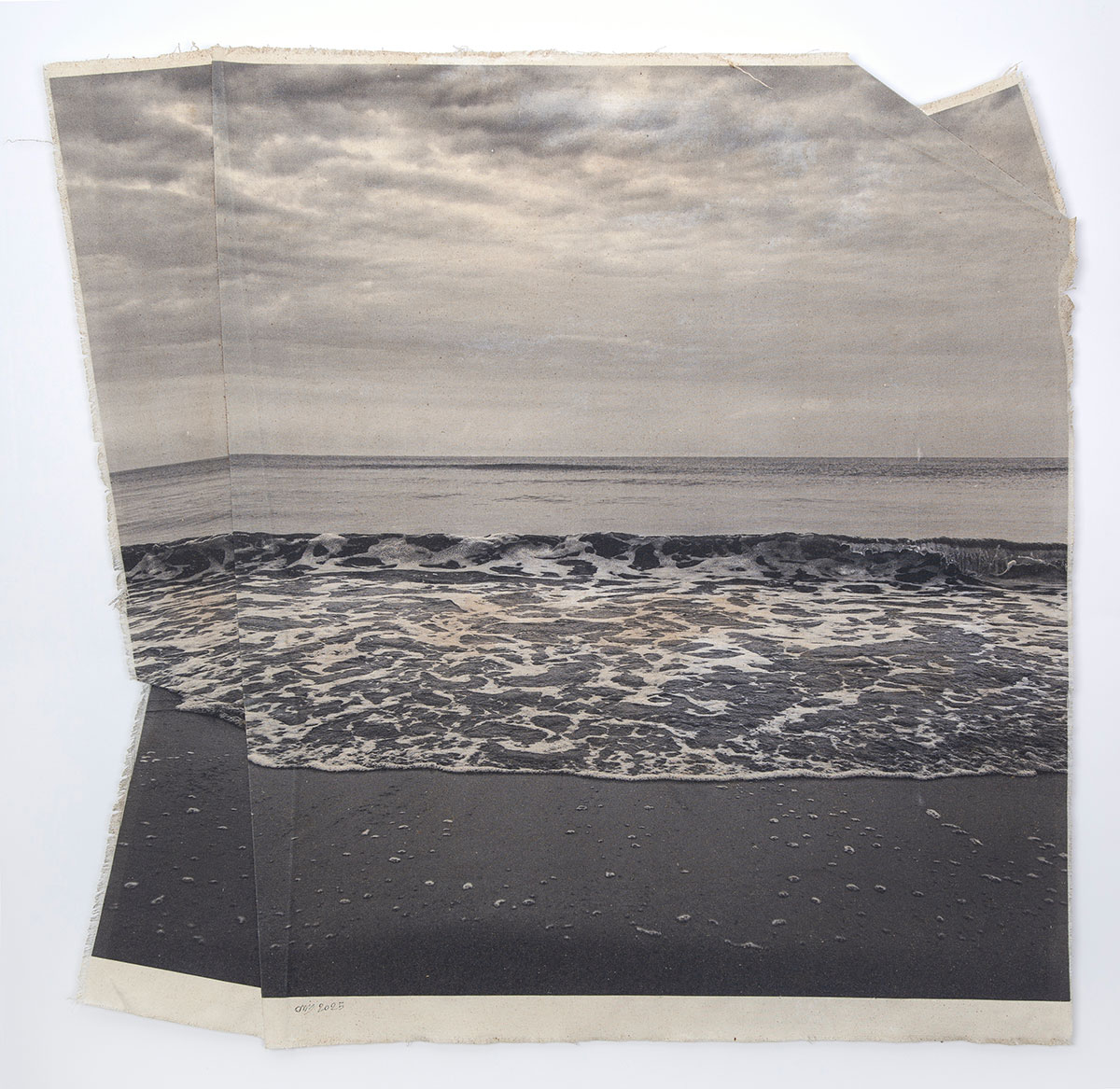 هنرمند عکسهای این مجموعه را در طول سه سال گذشته گرفته و زمان پس از آن را صرف اندیشیدن به این پرسش کرده که چگونه سوژهای با این عظمت میتواند وضعیتِ متناهیِ همهی پدیدهها را بیان کند. مهدیزاده در ادامهی رویکرد دیرینهی خود در دستکاری تصویر عکاسانه، اینبار عکسهایش را بر روی پارچهی متقال چاپ کرده؛ زمینهای که امکان مداخلهی فیزیکی بیشتری را فراهم میکند. او به پارچه با استفاده از سریش و مواد طبیعی مانند بابونه و افتیمون بافت بخشیده، آن را با چای و قهوه رنگ کرده و در نهایت سطحش را پاره کرده است. در نتیجهی این فرایند، تصویرِ بهظاهر بینهایتِ دریا به ابژهای دستکاری و قاببندیشده و درعینحال بیثبات بدل شده است.